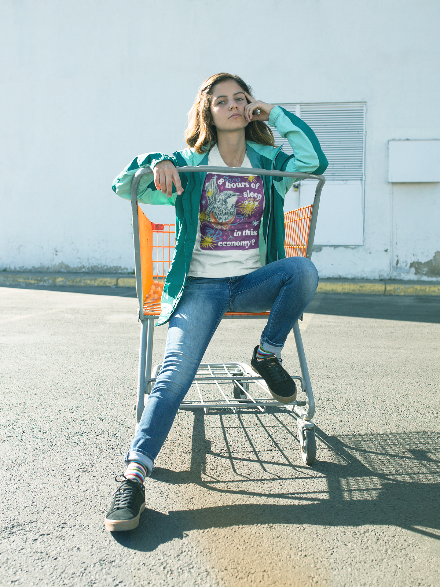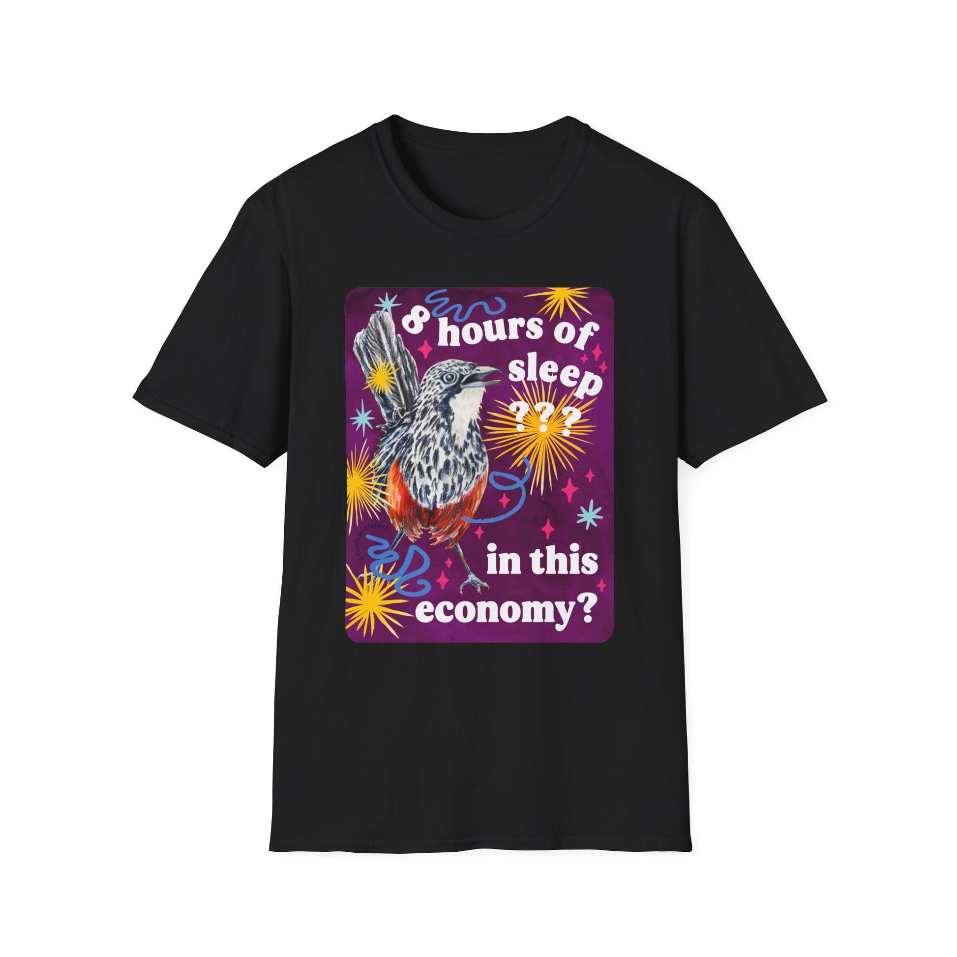 This lightweight cotton tee carries a sharp, tongue-in-cheek energy — a bright, slightly retro graphic of a bird surrounded by fireworks and the cheeky line “8 hours of sleep in this economy?” It sits on a smooth, soft jersey that drapes easily and feels breathable all day. Wear it when you want to riff with fellow night-owls, spark a laugh at a casual meet-up, or add a playful layer under a jacket. The stitched ribbed collar and shoulder-tape keep the shape through washes, while the tear-away label prevents itch and adds simple comfort. The colors pop against the breathable white base, so the design reads crisp whether you’re out for coffee or lounging at home.