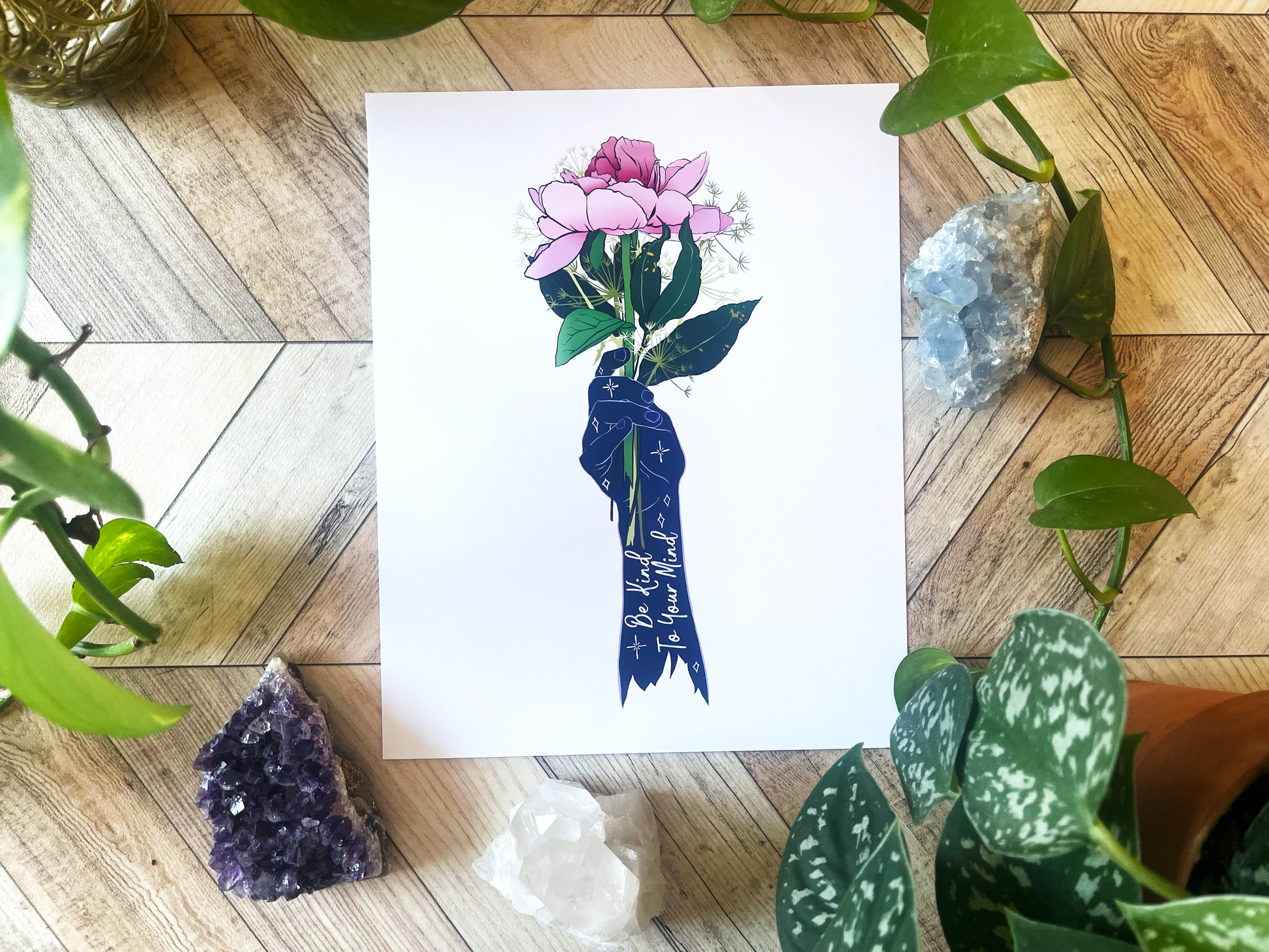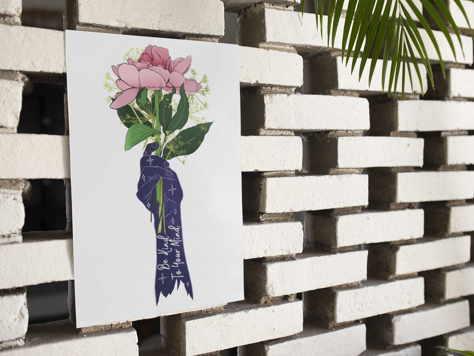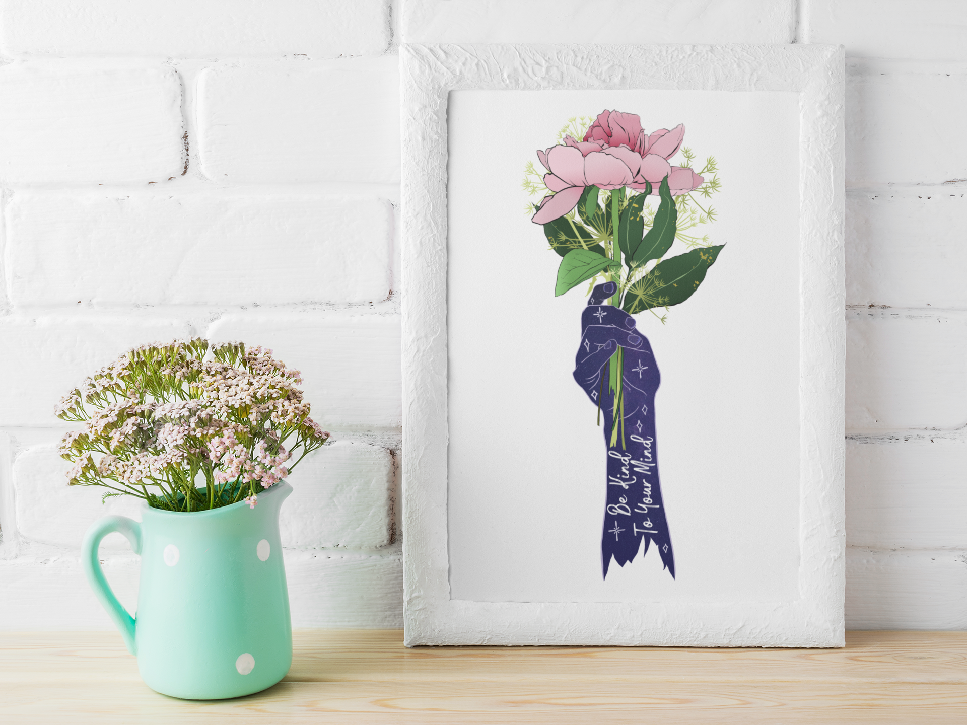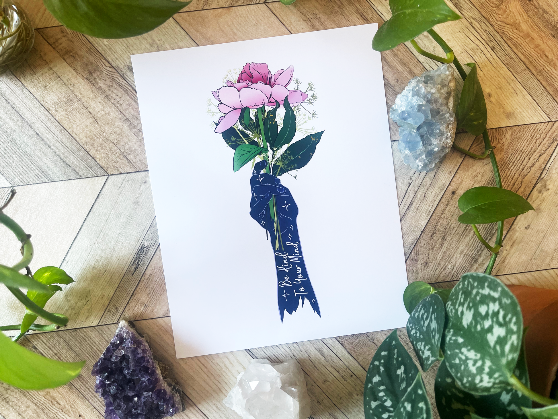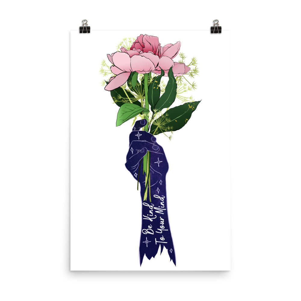 Add a wonderful accent to your room or office with a print of this affirming quote, "Be Kind To Your Mind"