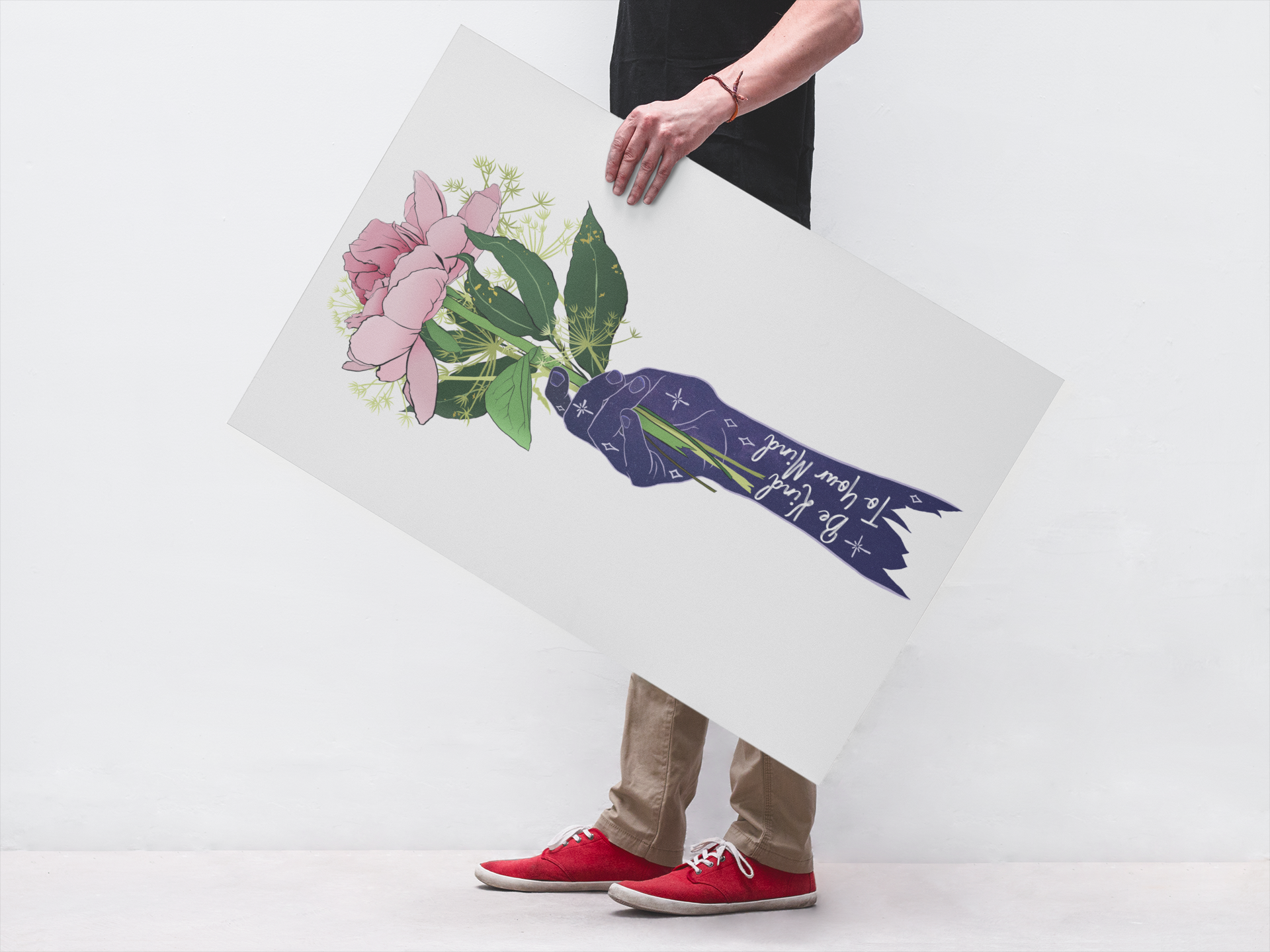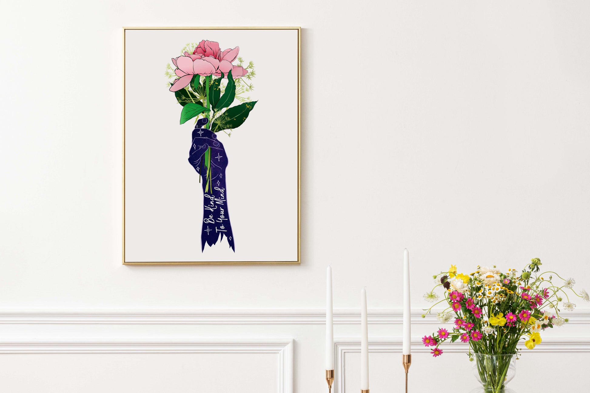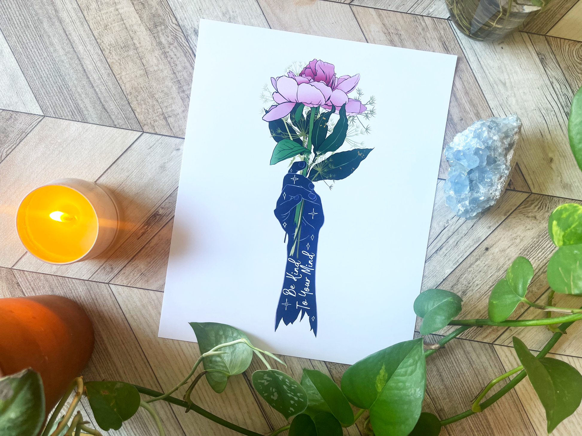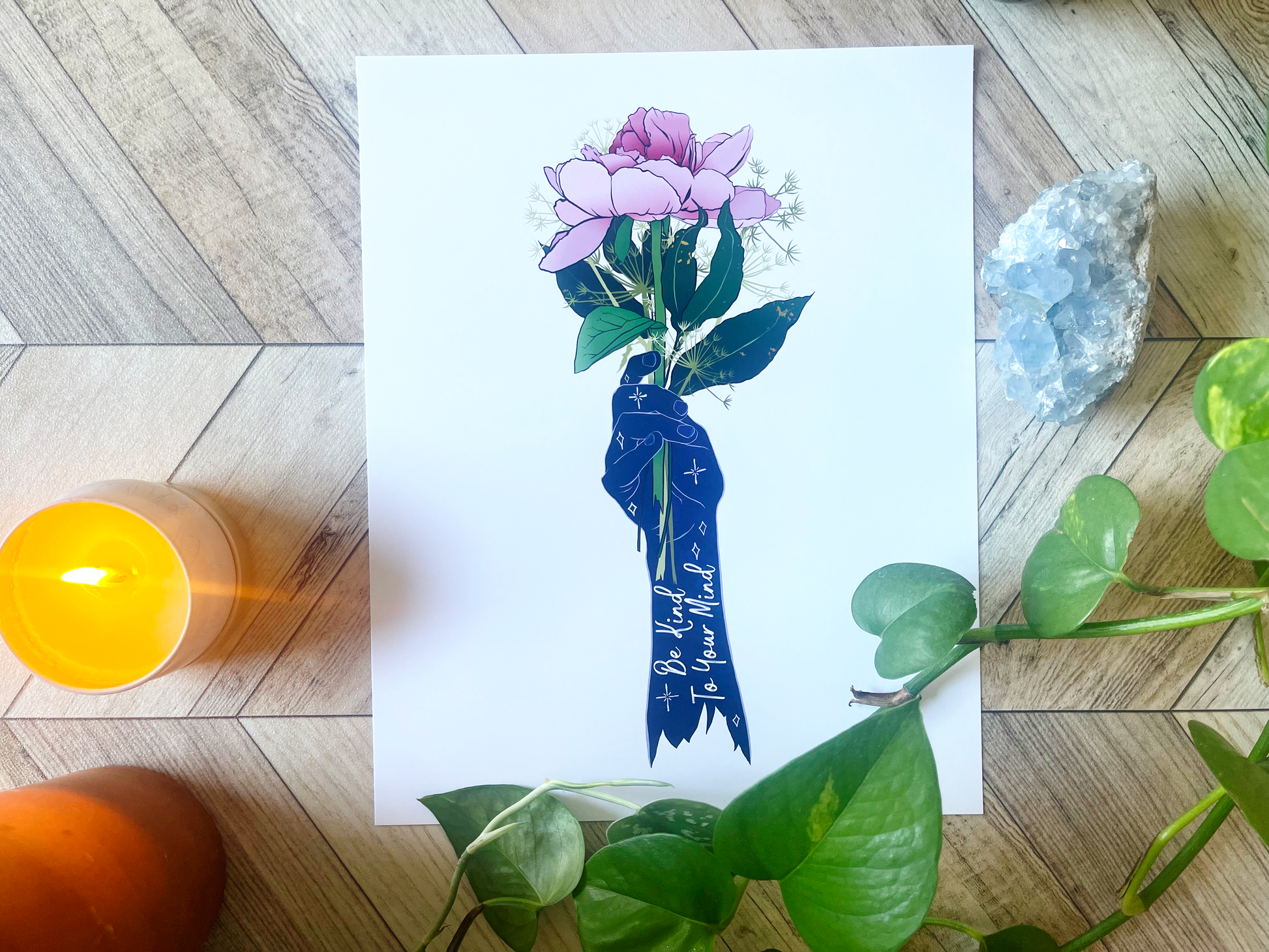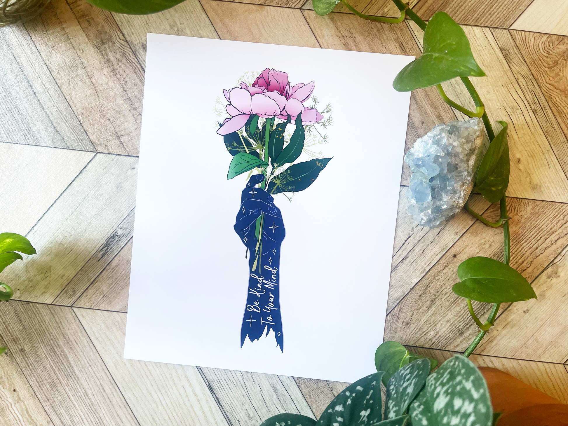 Add a wonderful accent to your room or office with a print of this affirming quote, "Be Kind To Your Mind"