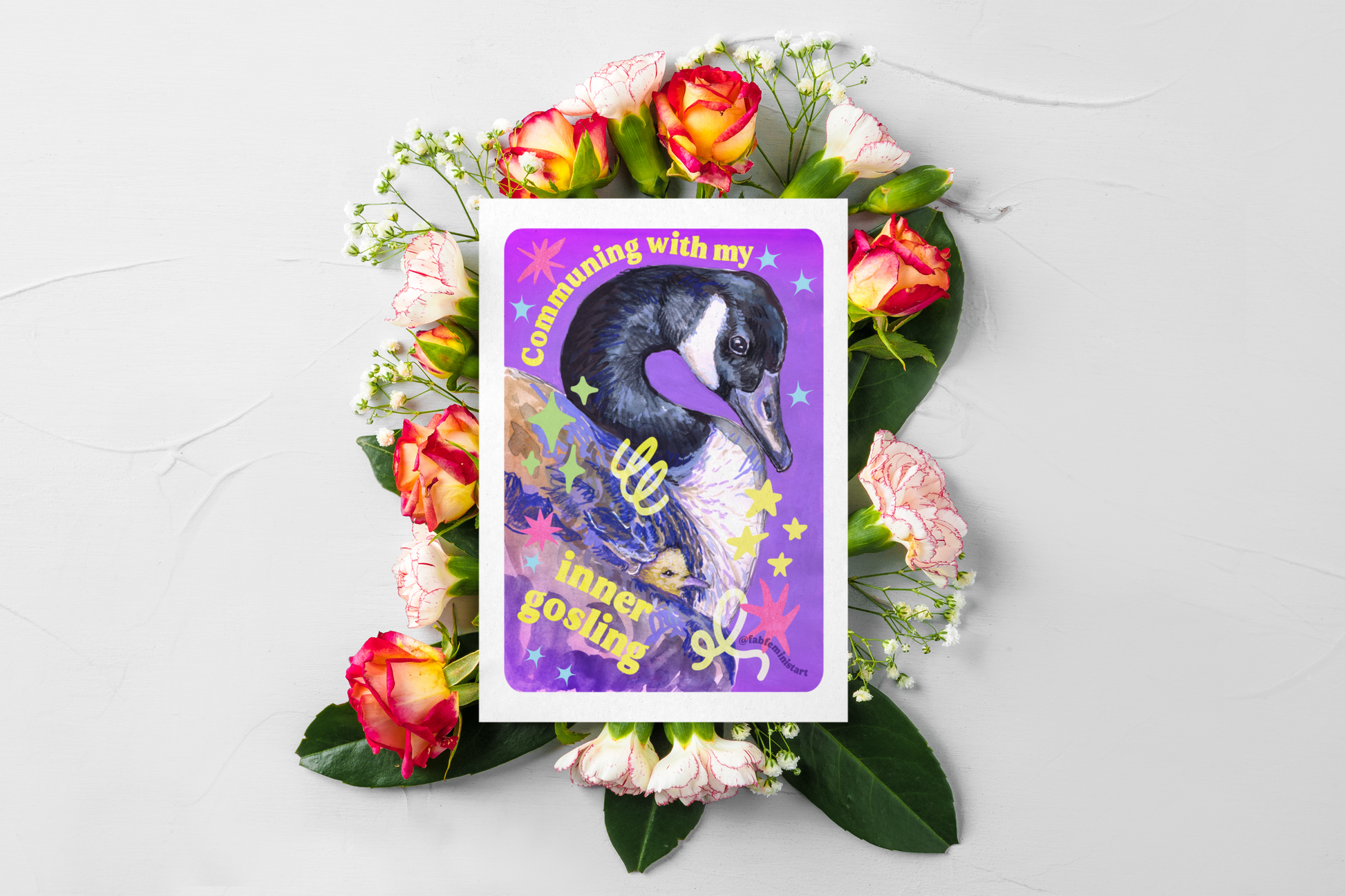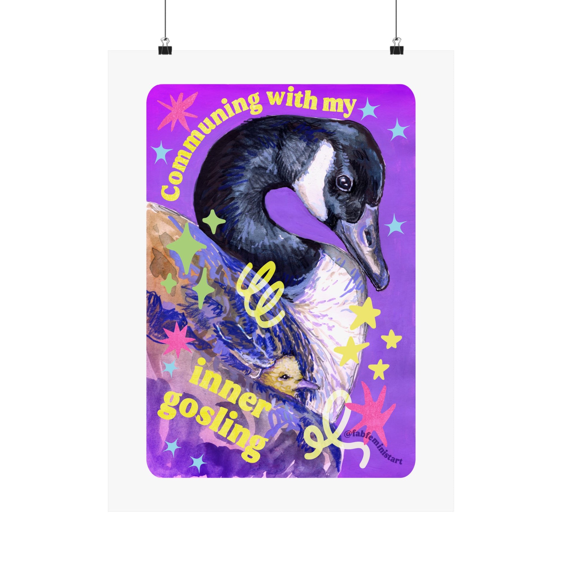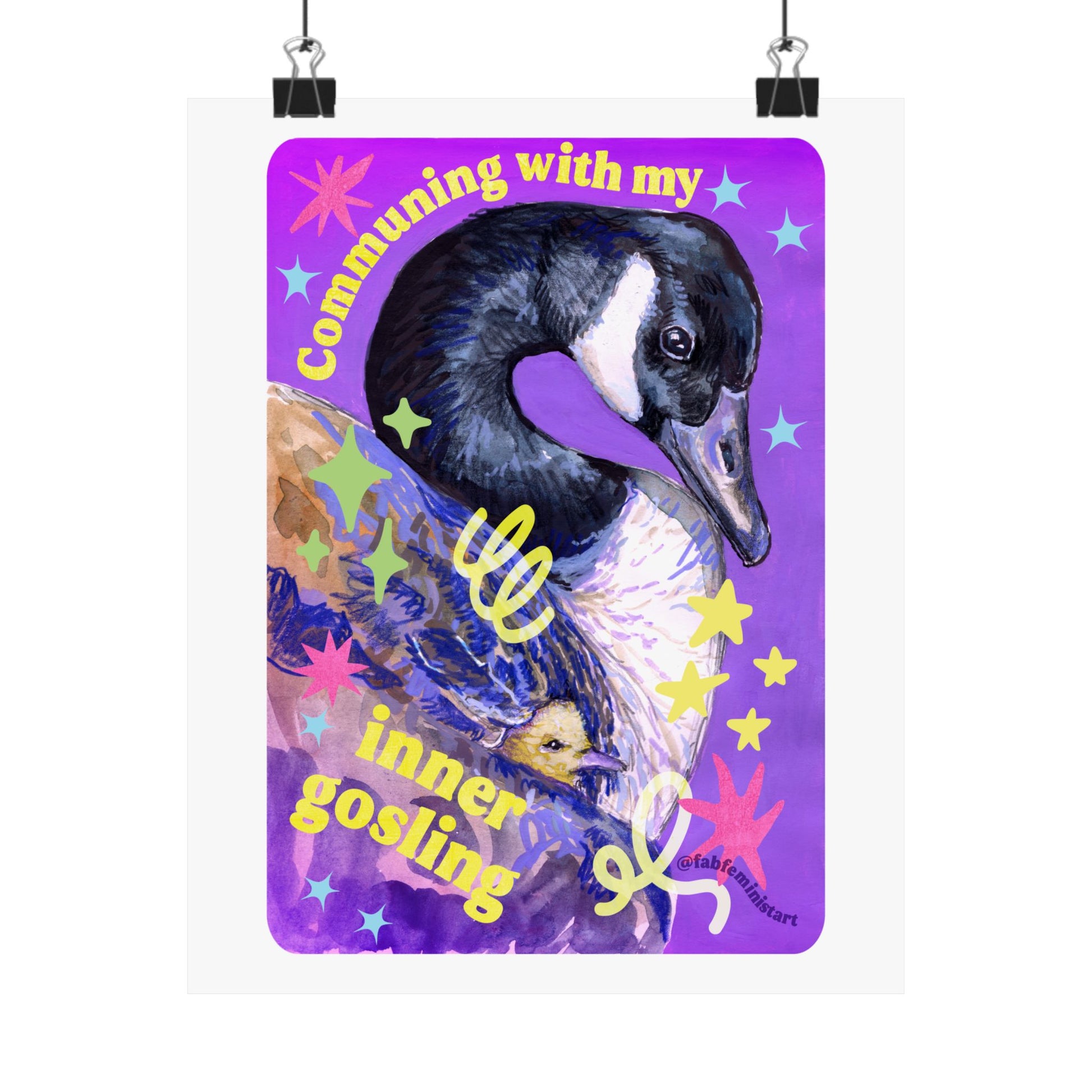 A vibrant matte poster that brings playful, cozy energy to any indoor wall. Rich giclée colors pop on archival museum-grade paper, showing every brushstroke and feather detail in long-lasting clarity. The illustration — a tender adult goose with a fuzzy gosling and a bold purple background — reads like a private, whimsical moment: soft maternal warmth framed by retro stars and hand-lettered text that reads "Communing with my inner gosling." It fits neatly into reading nooks, art corners, or bedroom walls where nostalgia and gentle humor live. Available in many sizes, this poster is made to stay bright and matte-finished without glare, and it arrives ready for your favorite frame or clip-hanger.