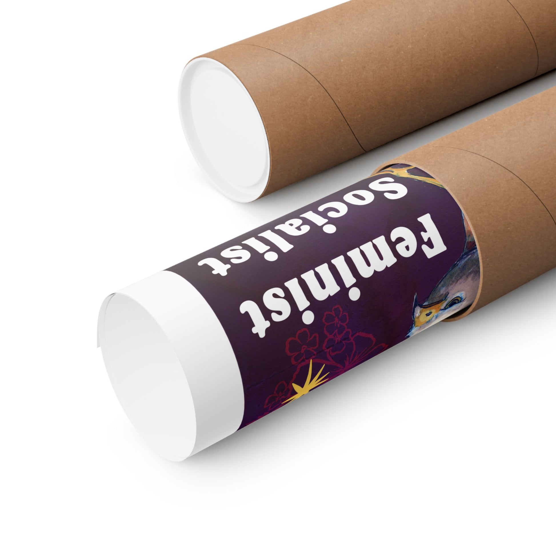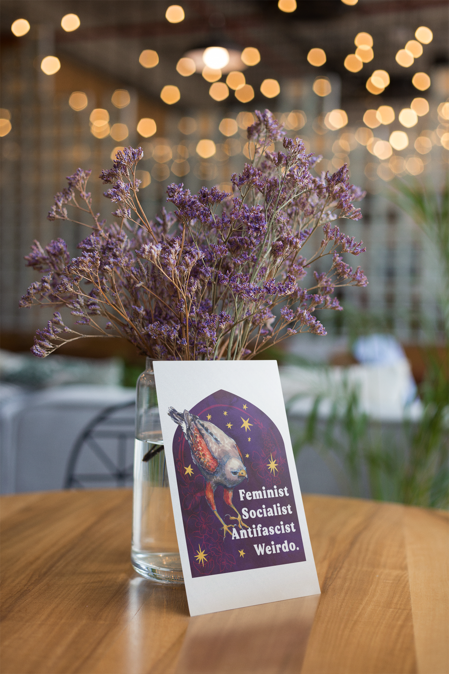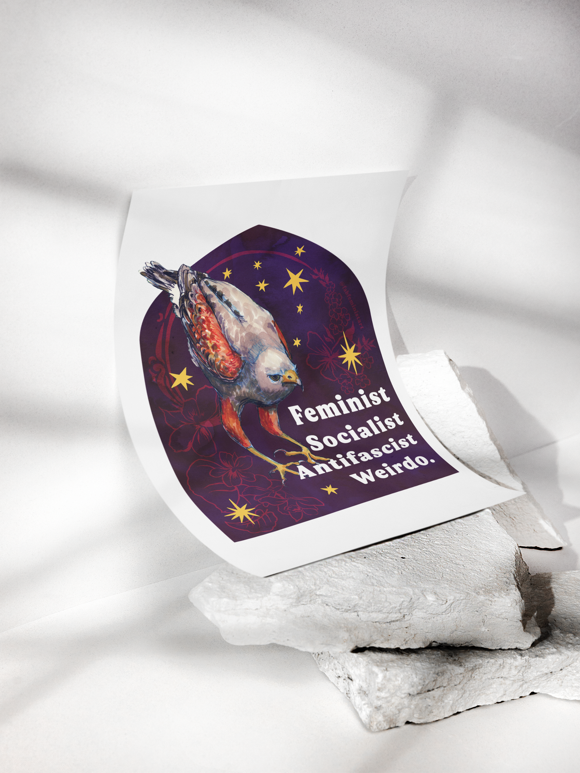 This matte vertical poster brings bold politics and whimsical art together. A vividly painted bird swoops across a deep purple, star-studded arch while clear, confident type reads: “Feminist Socialist Antifascist Weirdo.” The museum‑grade paper and giclée printing keep the colors rich and textured without glare, so the poster feels like a small alt-gallery piece on your wall. Hang it in a study, living room, or shared common space to announce values with humor and heart. It settles into everyday life — a reminder on slow mornings, a conversation starter at gatherings, a rebellious accent above a reading nook.