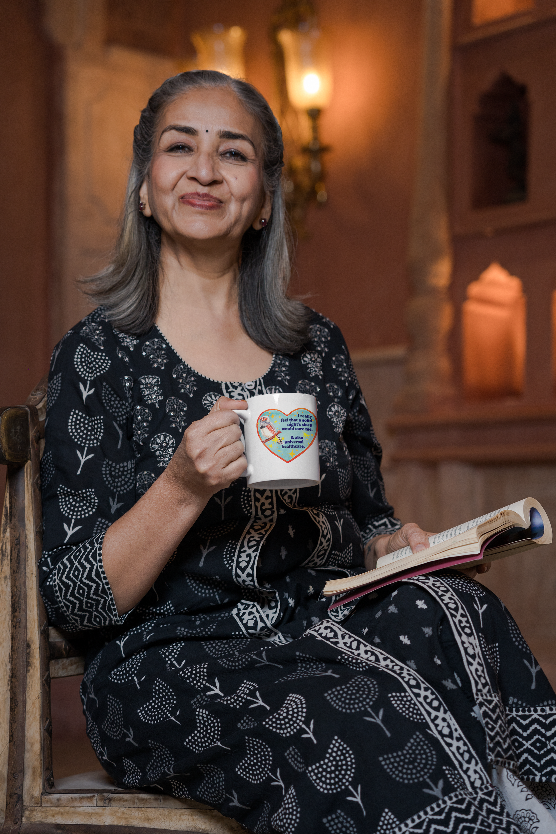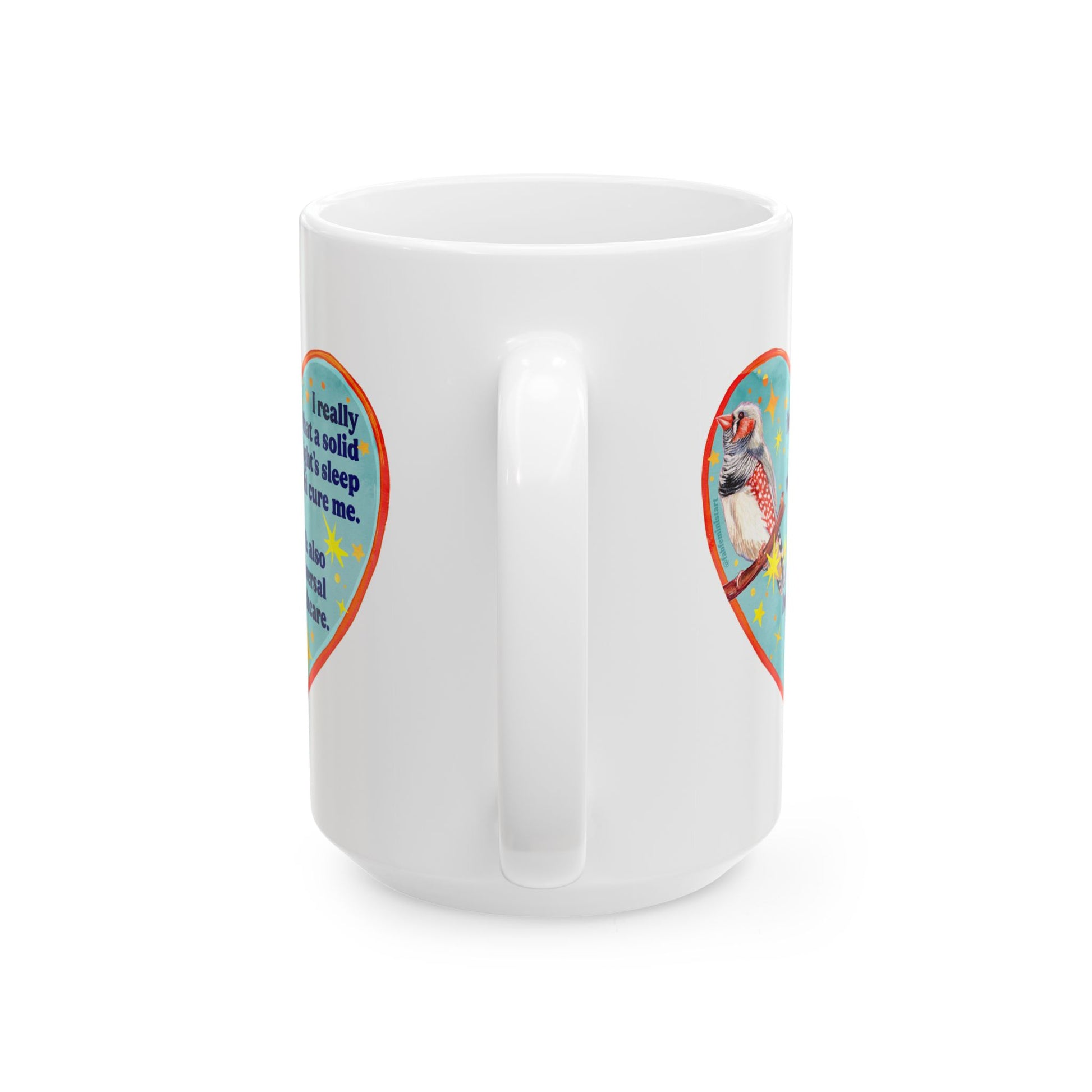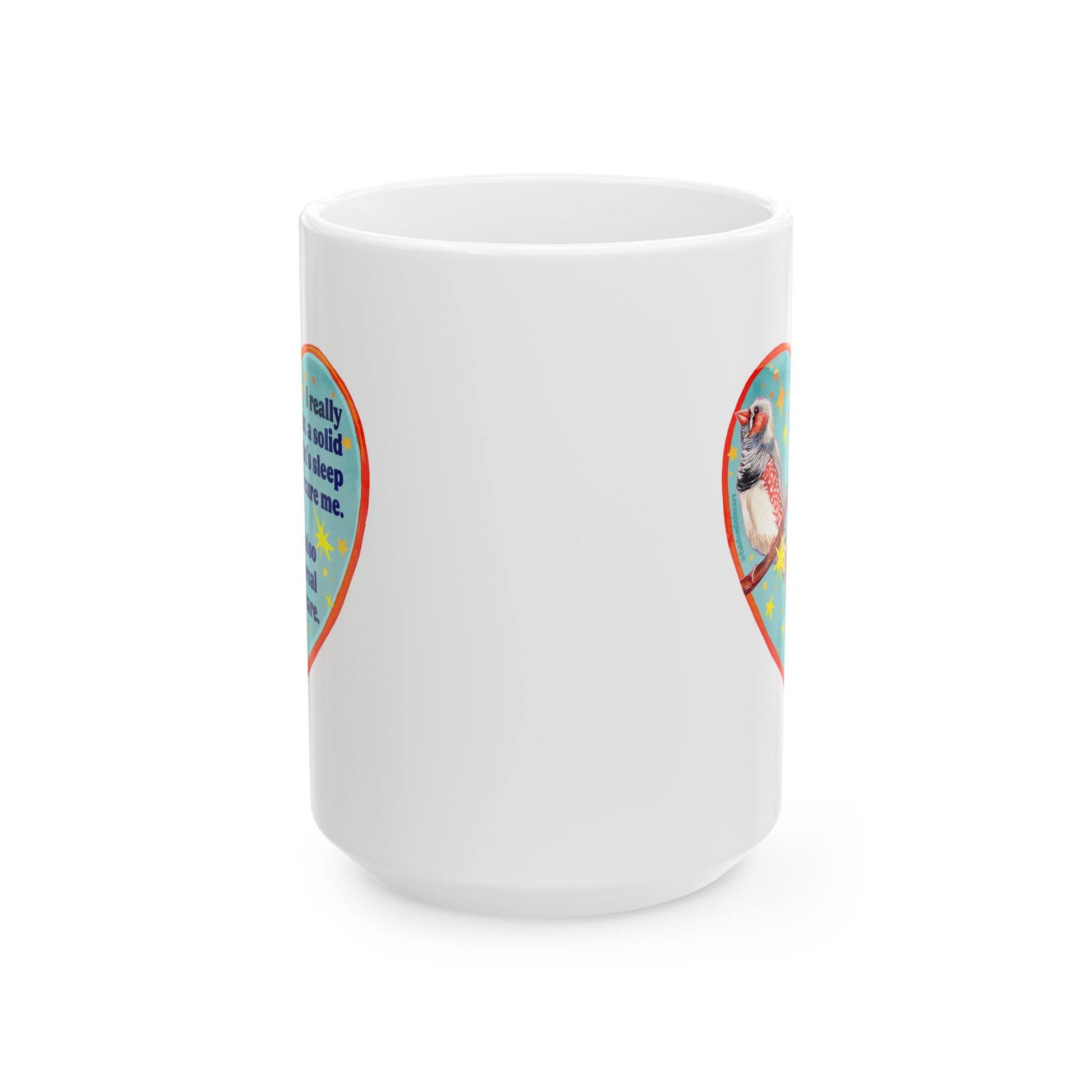 Bright, glossy ceramic mug that brings a playful, heartfelt moment to everyday coffee or tea. A colorful heart-shaped panel wraps the mug with a charming illustrated bird and a short, soulful message—small enough to fit on your desk, loud enough to make you smile. The vivid print pops against the clean white ceramic, and the comfortable C-handle feels familiar in your hand as you sip. Microwave- and dishwasher-safe, it’s built for everyday routines and lazy mornings, showing personality without asking for attention. Lead- and BPA-free, available in two sizes so you can choose how much comfort you need in one cup.