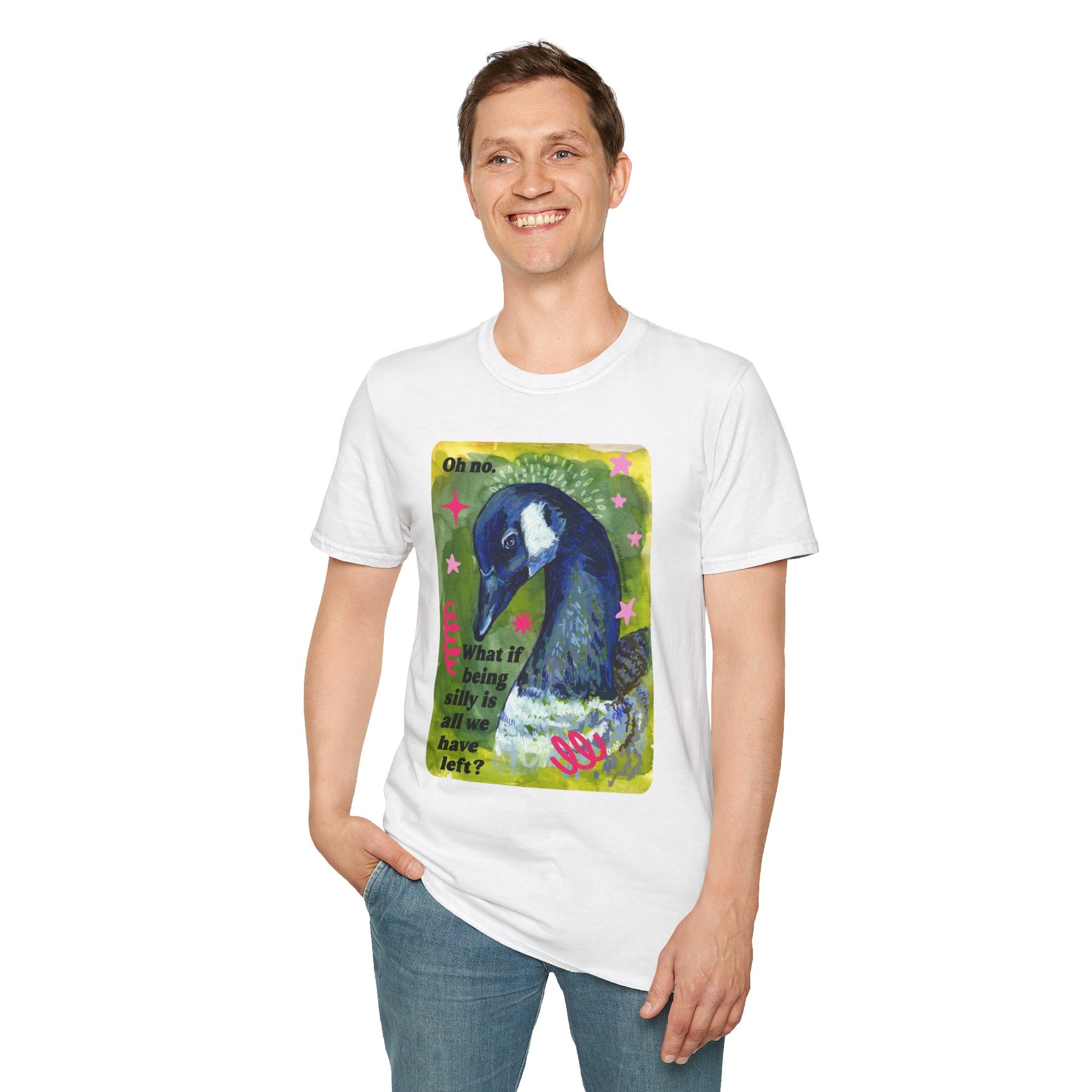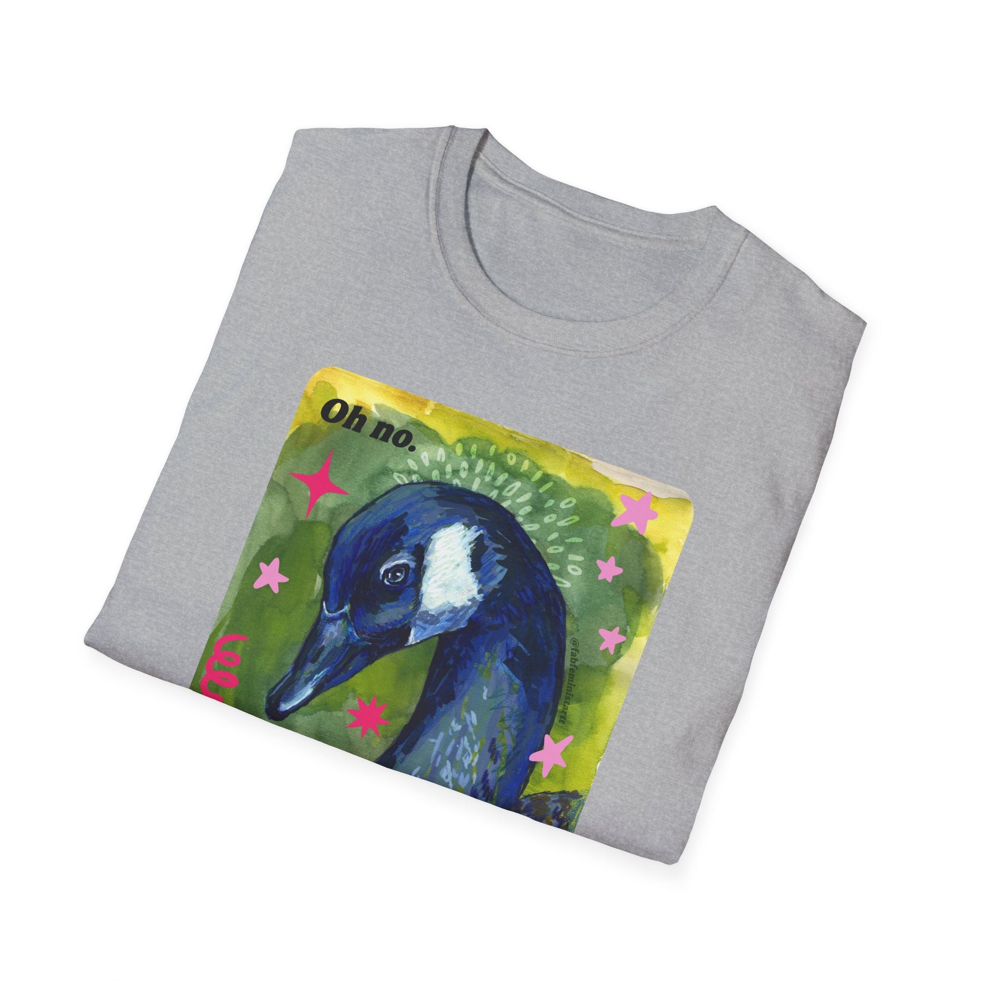 A soft, wearable canvas for a quirky, melancholic print — this lightweight tee carries a hand-painted goose portrait framed in neon greens and warm pinks. The image feels like a small, private daydream: a thoughtful bird with painterly brushstrokes, layered text, and doodled stars that read like a whispered joke. It sits casually on a classic crew silhouette so the artwork becomes the conversation starter. Wear it when you want to soften a crowded room, stroll through weekend markets, or curl up with a sketchbook. The breathable cotton and clean lines keep the focus on the art while offering all-day comfort.