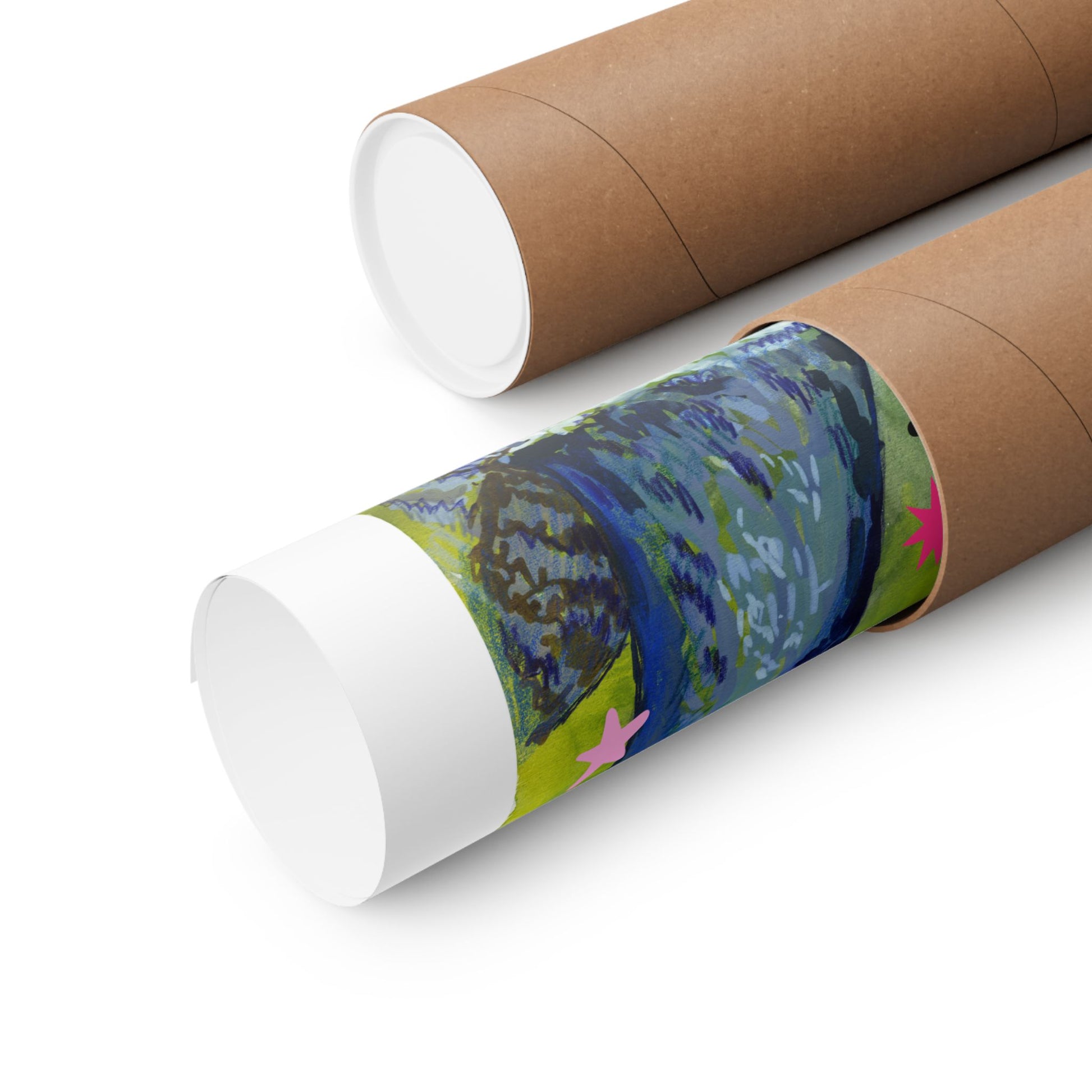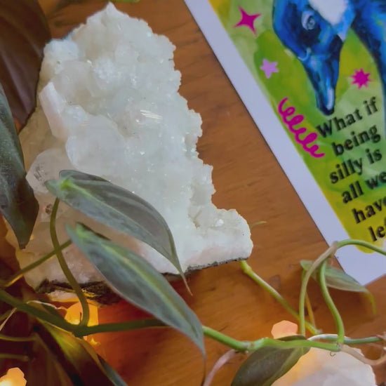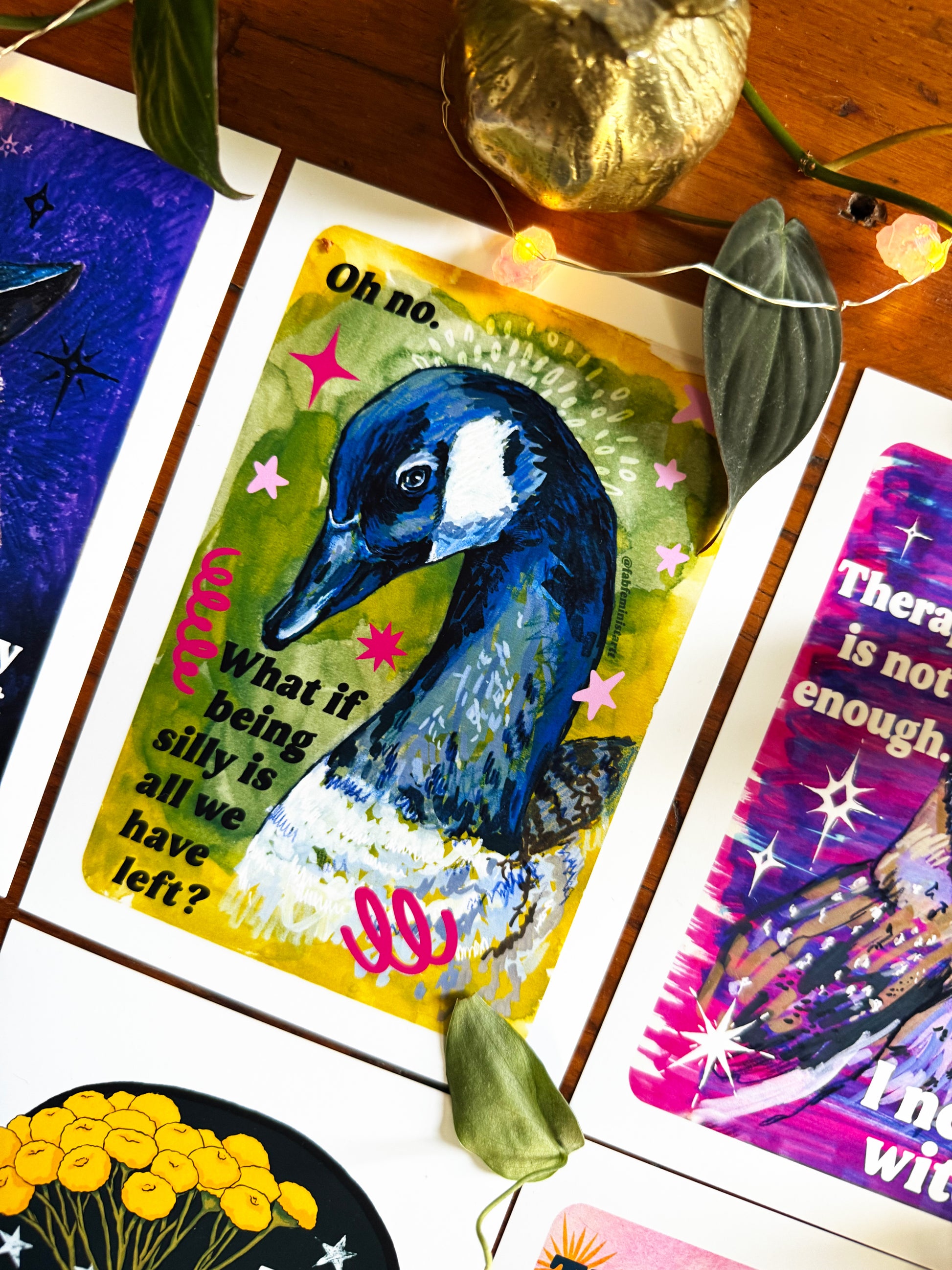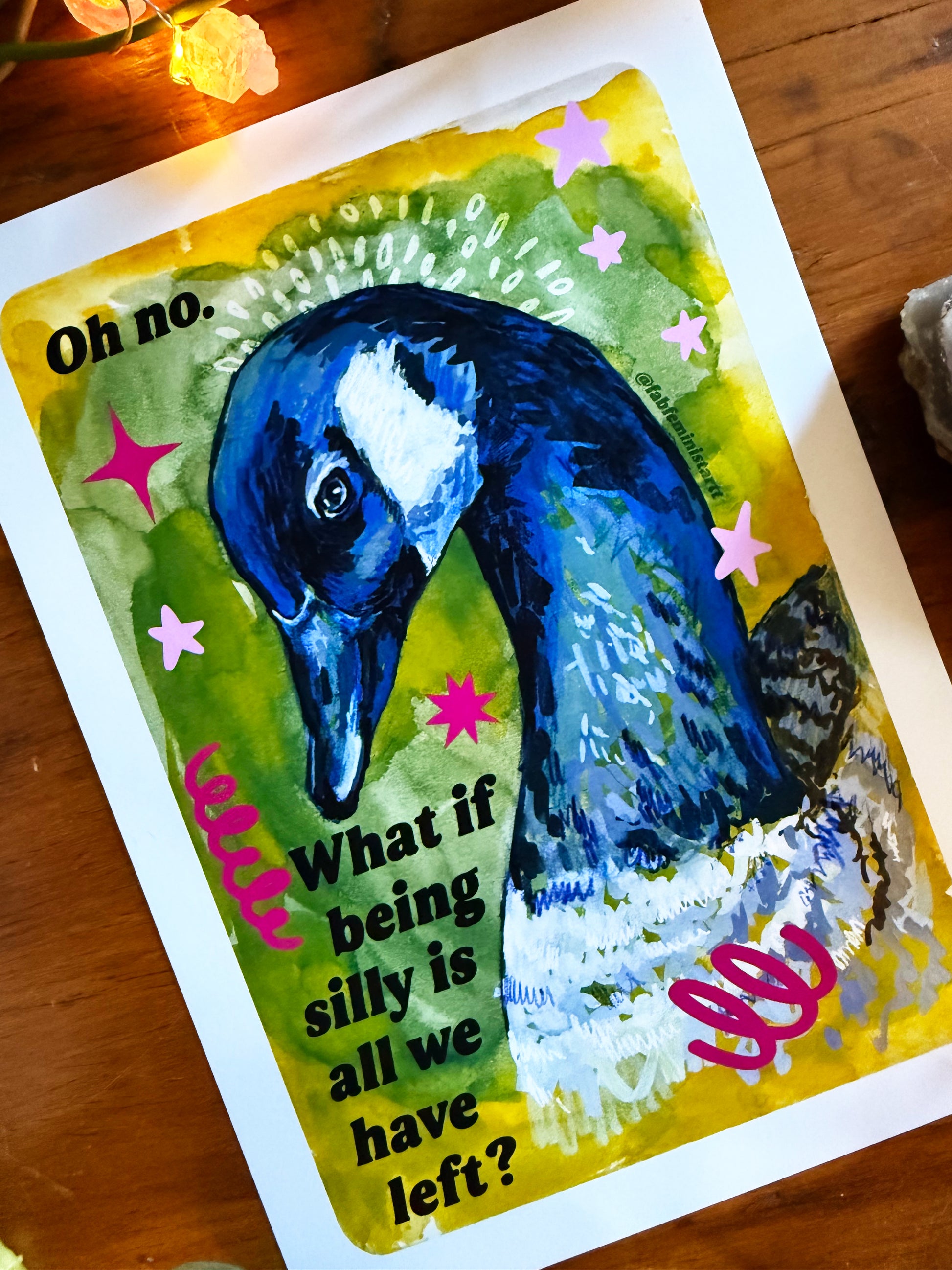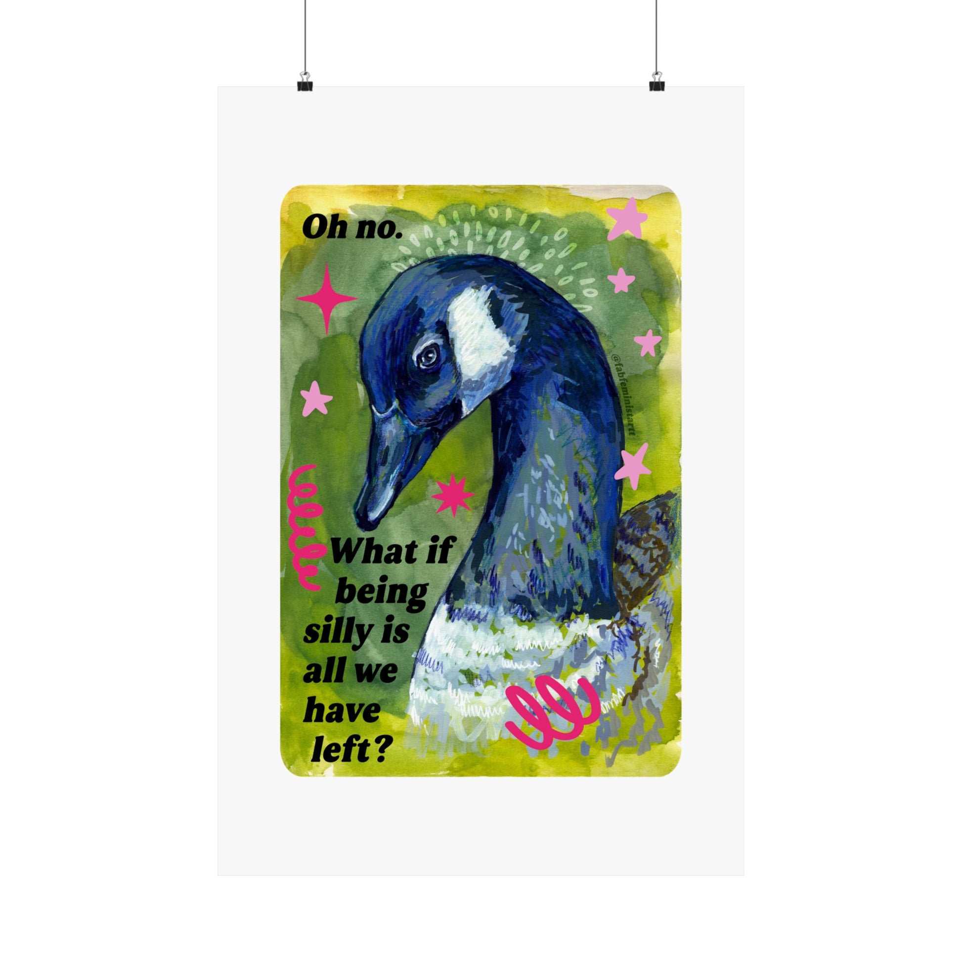 This matte vertical poster pairs playful, painterly art with a wry, thoughtful line: “Oh no. What if being silly is all we have left?” A richly textured goose portrait in deep blues sits against a lively moss-green wash, accented with hand-drawn pink stars and spirals. The matte surface keeps reflections soft and emphasizes brush strokes and color depth, letting the Giclée reproduction retain crisp contrast and vivid hues over time. Choose from many sizes to frame a cozy nook, gallery wall, or studio — the print brings a mix of humor, melancholy, and warmth to any indoor space where quiet reflection or lighthearted levity is welcome.