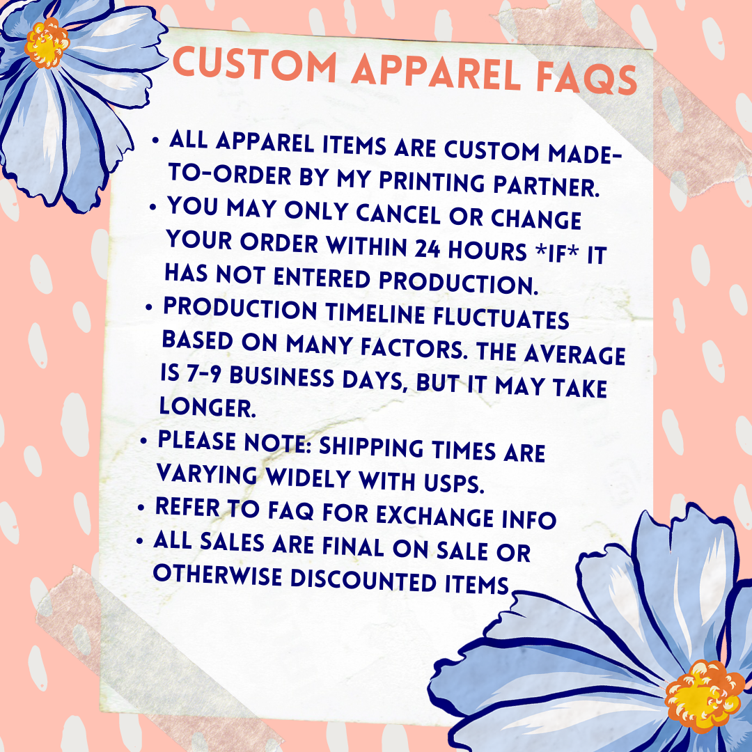 Tees are made to order directly from the printer, so I cannot offer returns. However, if you purchase the incorrect size I *may* be able to process an exchange. See details below: