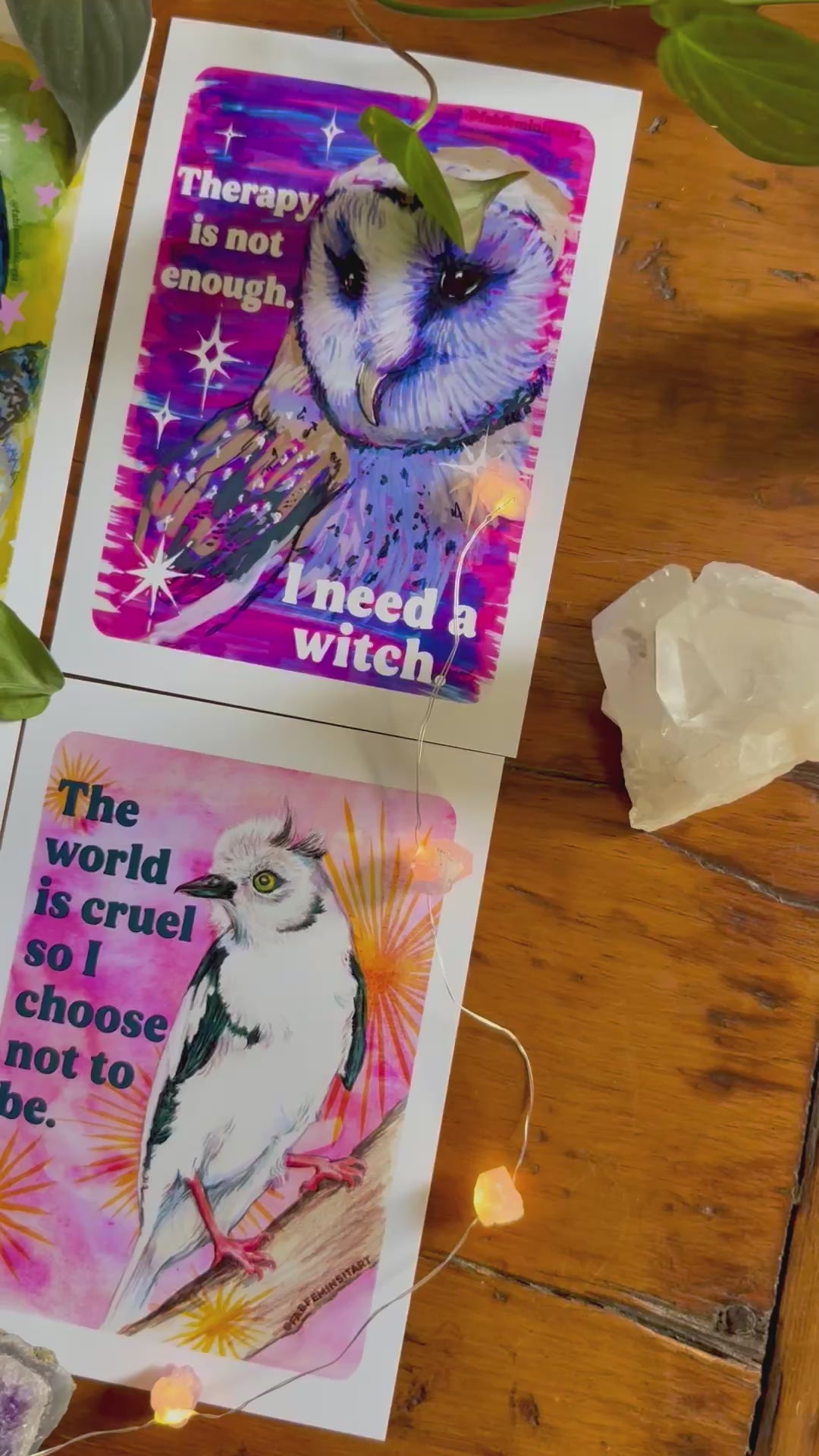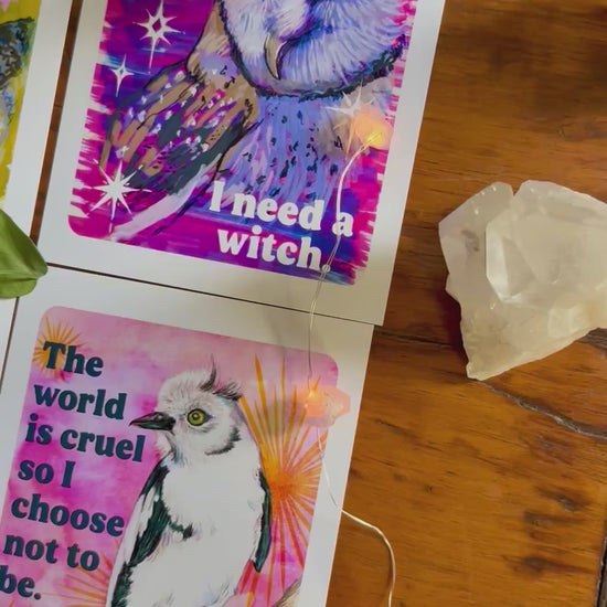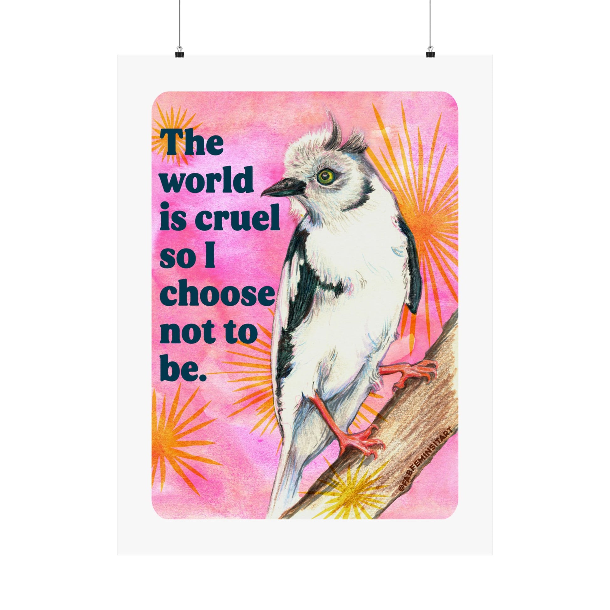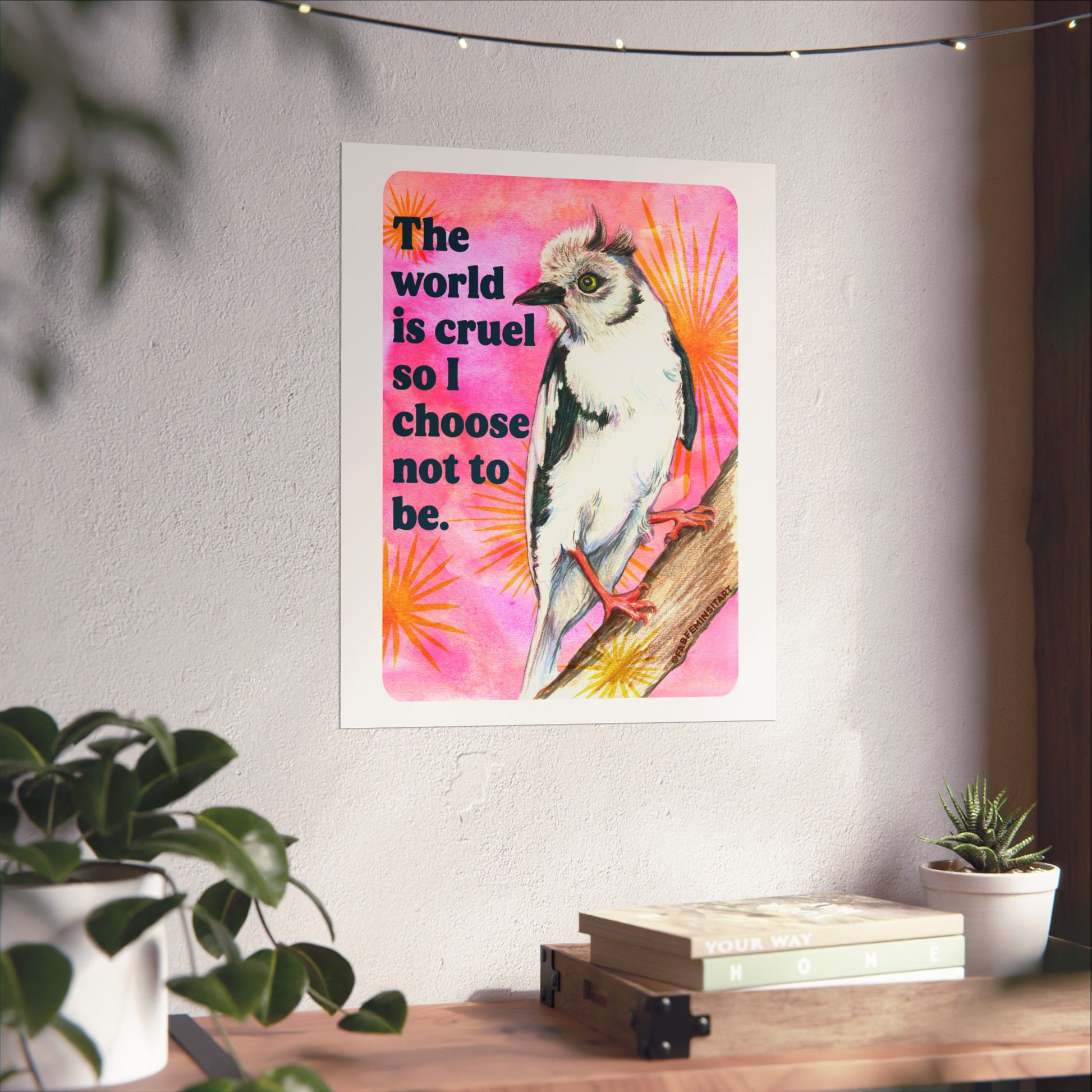 A matte vertical poster that blends soft, hand-drawn illustration with a bold, introspective message. A small, crested bird perches on a branch against a wash of warm pinks and starburst accents while the text reads: “The world is cruel so I choose not to be.” The museum-grade paper and giclée printing keep the watercolor-like tones rich and true, while the matte finish reduces glare and gives the piece a quiet, gallery-ready presence. It hangs easily in a reading nook, bedroom, or studio — a gentle reminder to respond to the world with kindness rather than harshness. Fits into calm, mindful spaces and complements eclectic, vintage, or cottagecore decor.