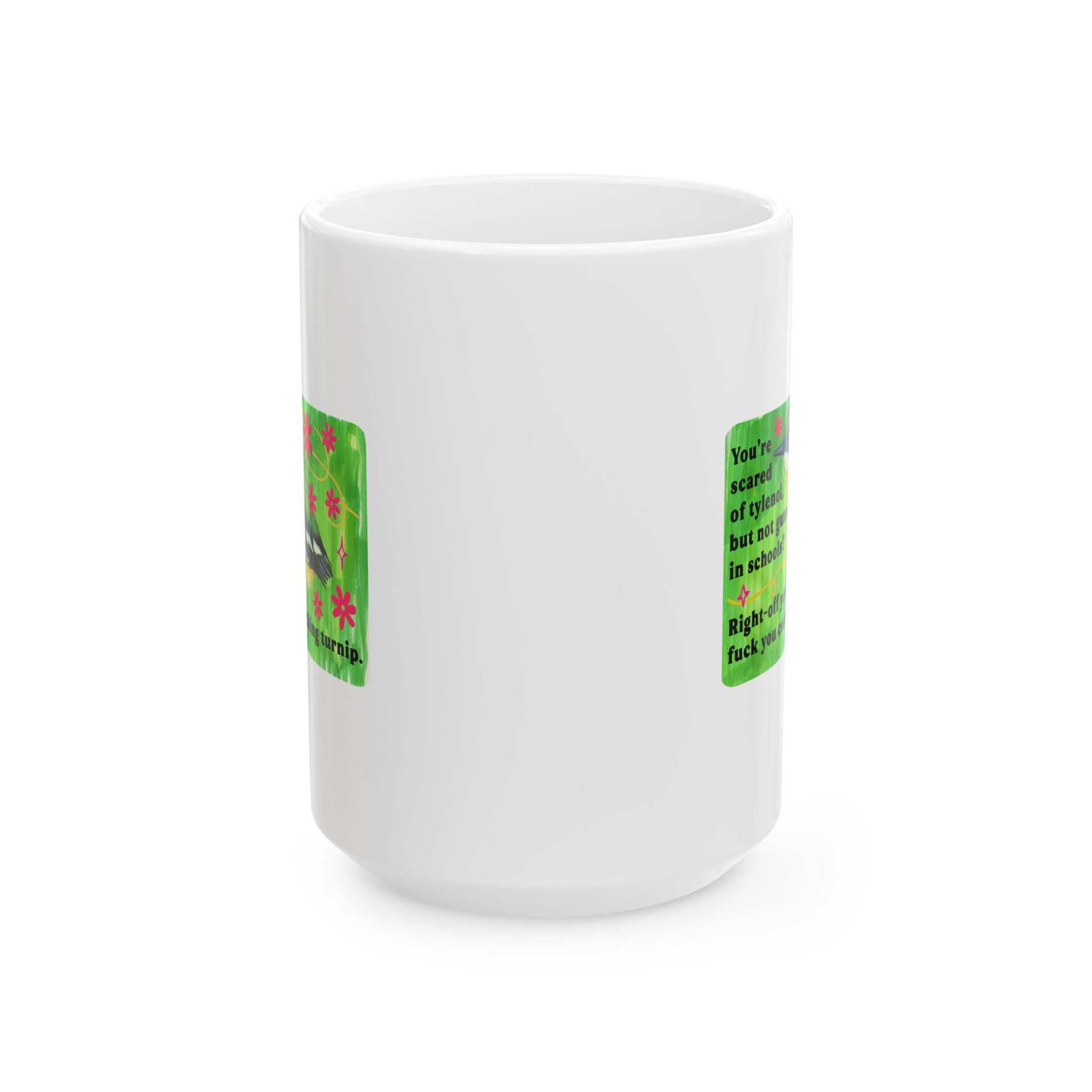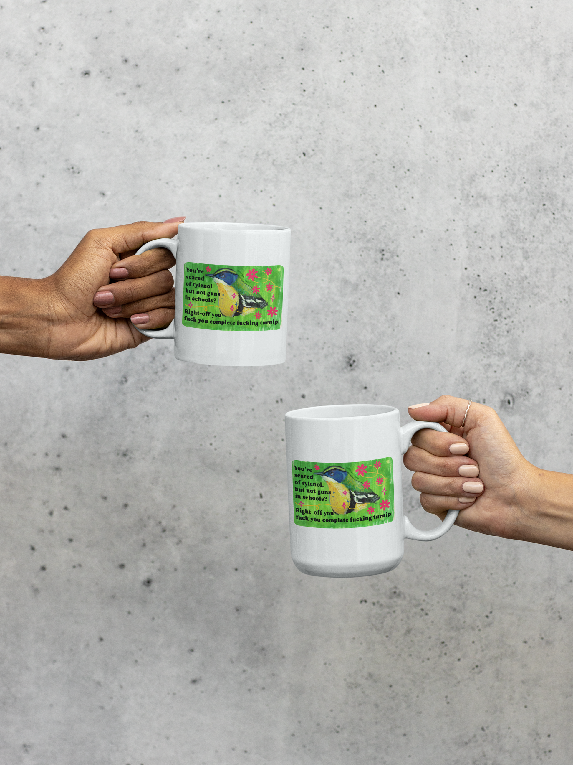 You're scared of tylenol, but not guns in schools? Right-off you fuck you complete fucking turnip: feminist mug